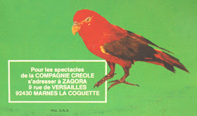 Turntable Treasures and House of Records is the other store I visited on my trip to Tacoma last Friday. They've moved around the corner from where they were the last time I was there about seven or eight years ago, but their new spot is as cluttered and junky as ever, and it feels like they've been stuck there for decades. Unfortunately, the older fellows who run the place evidently got wind of the news that vinyl sales have been on the upswing and that collecting has become popular with hipsters, and they're hoping to get themselves a big slice of the vinyl-sales pie. The first bin of records I thumbed through was filled with beat-up thrift-store staples like this and this and this, all of them marked at $20 apiece. (The friendly fellow behind the counter said to watch their Facebook page for info about featured sales on Sundays, so maybe those records are offered at a 190% discount at the end of every week to compete with the Good Will down the street.) But as is usually the case in stores where battered Huey Lewis records are going (or not going) for $15, you can usually find a few reasonably-priced treasures if you dig deep enough into the dustiest corners of the place. This lively and colorful 1983 LP by La Compagnie Creole is one of the neat things I found stuffed into the "World" section beneath the bins of "Pop and Rock," in the shelves near shoppers' kneecaps. Originally from French Guiana and the French West Indies, La Compagnie Creole are known for their happy-go-lucky music accompanied by joyful themes like rainbows, sunshine, and harmless animals, with a special emphasis on the Parakeet. You can read about them here. And then go here to read about La Compagnie Creole.